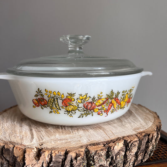 Vintage Harvest Vegetables Milk Glass Baking Dish With Lid