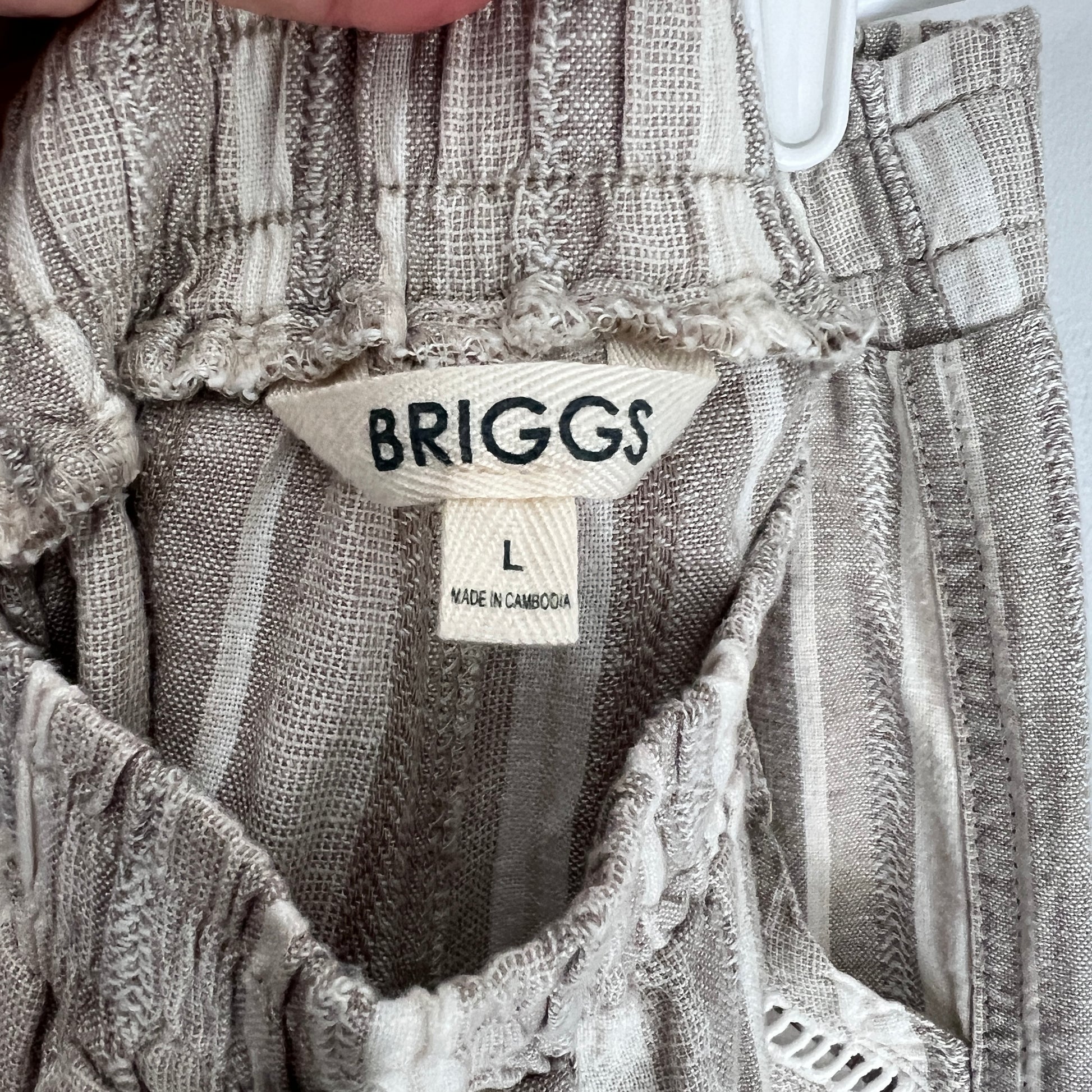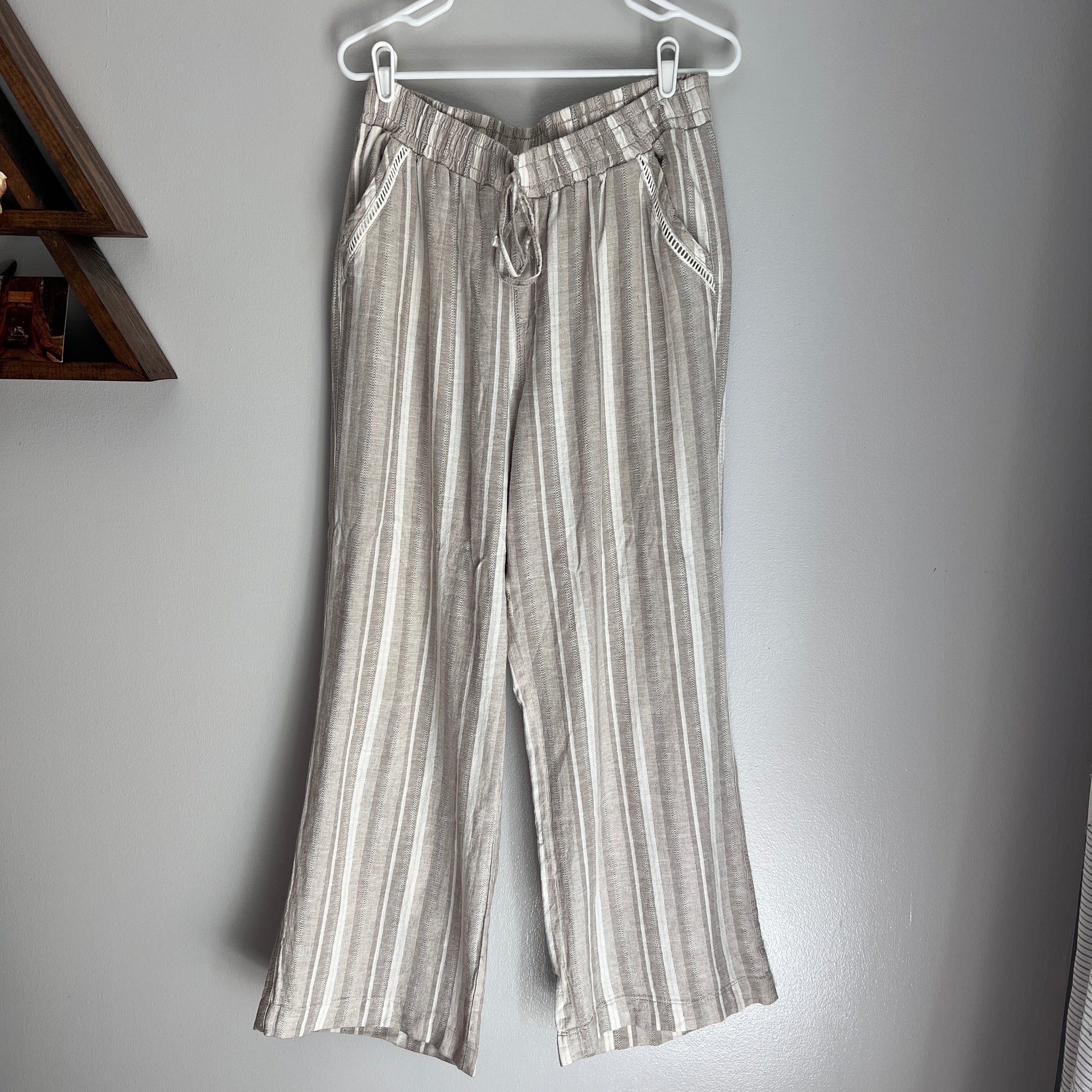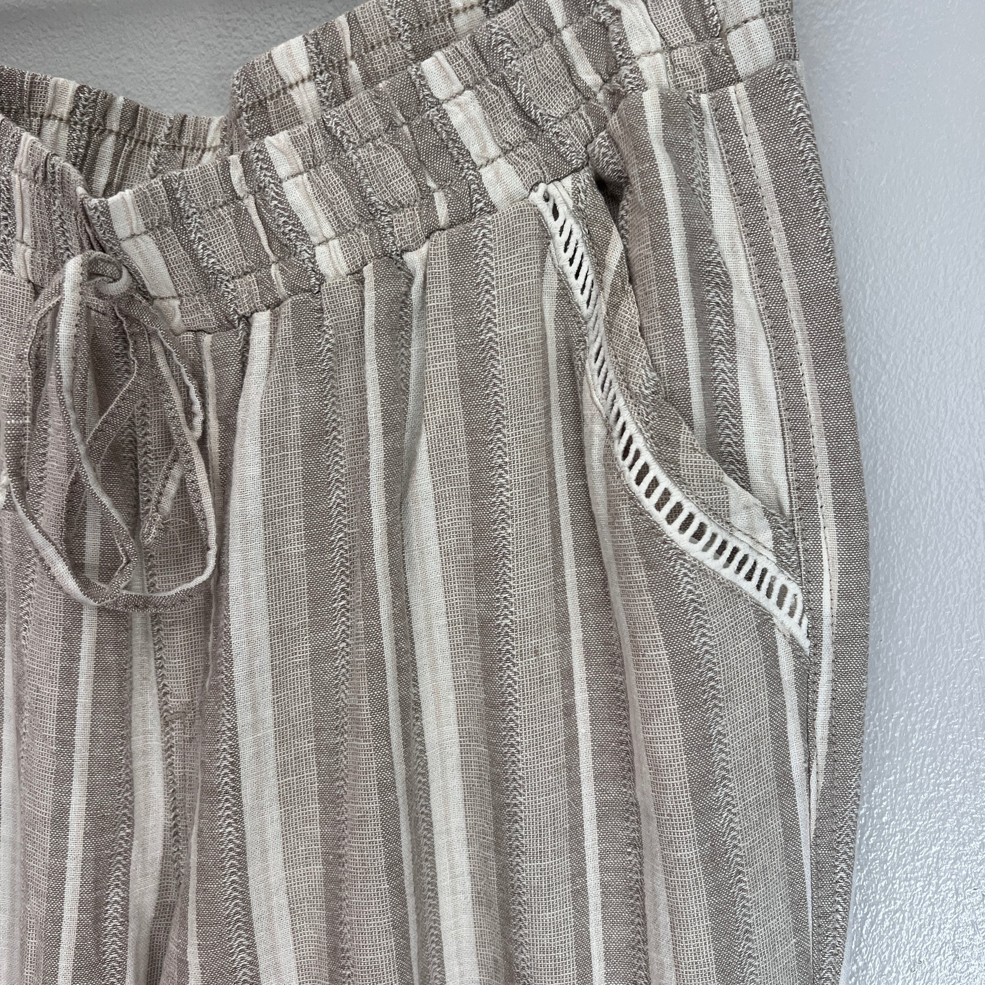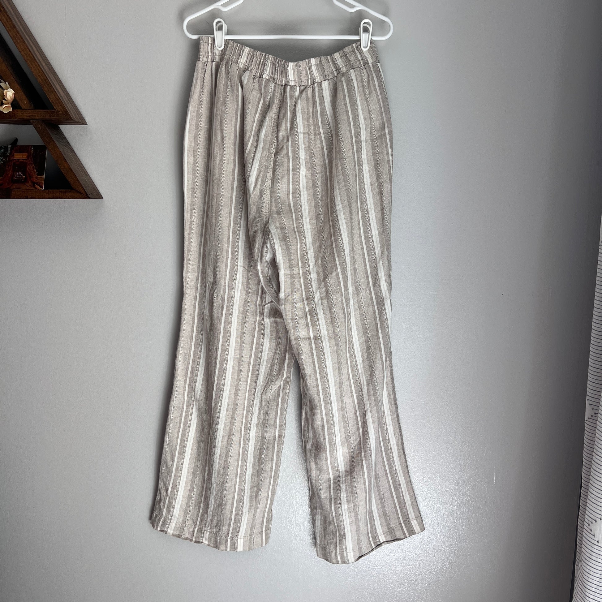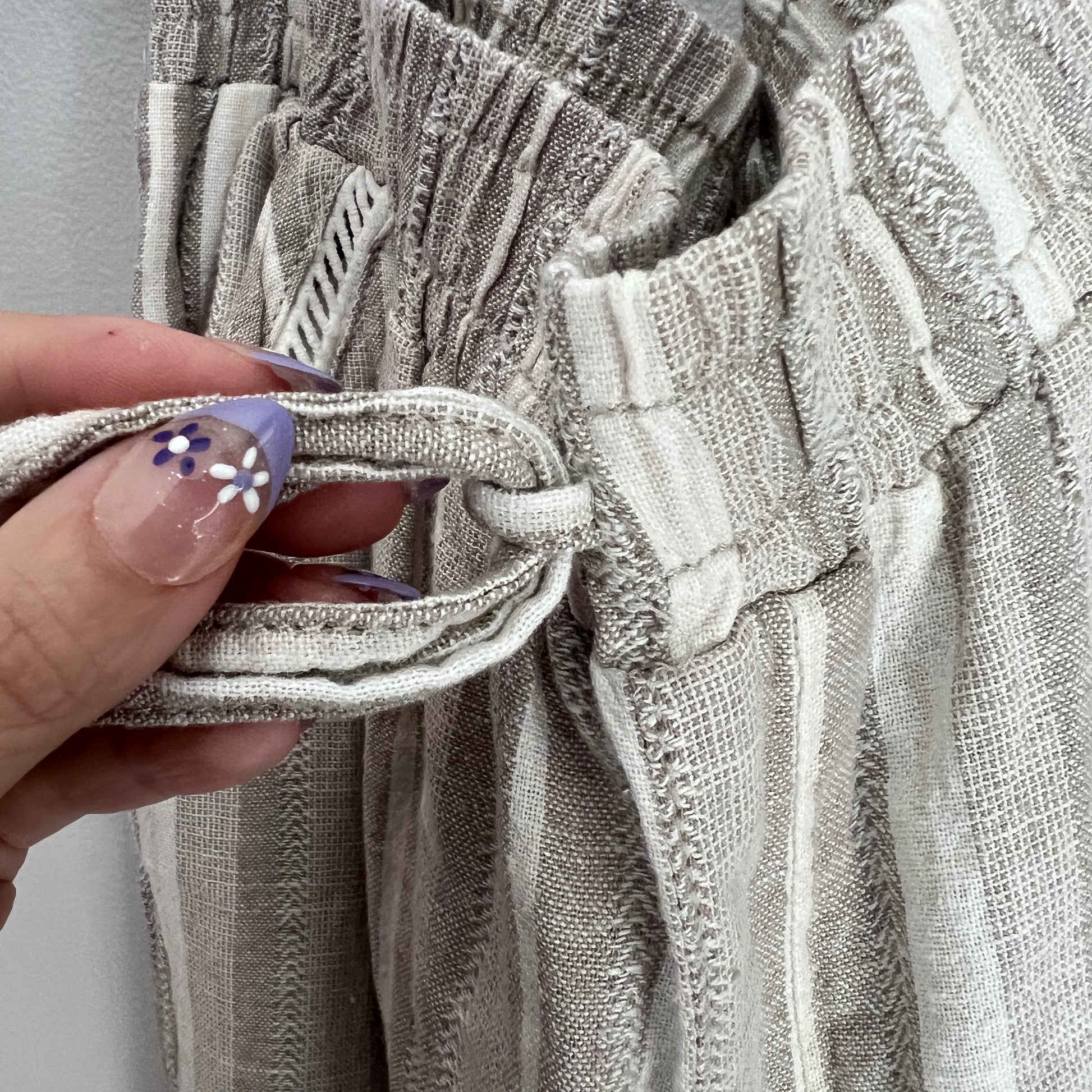 Briggs Grey and white striped linen pants with a relaxed fit, elastic waist and pockets